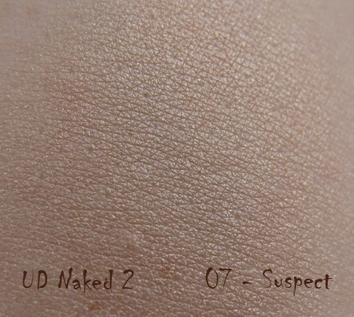 Suspect – нейтральный, цвет шампанского с добавлением бронзы (её видно, если нанести более интенсивно), шиммер серебристый. Пробовала его в разных комбинациях, как-то задел. Еще не распробовала, наверное 🙂